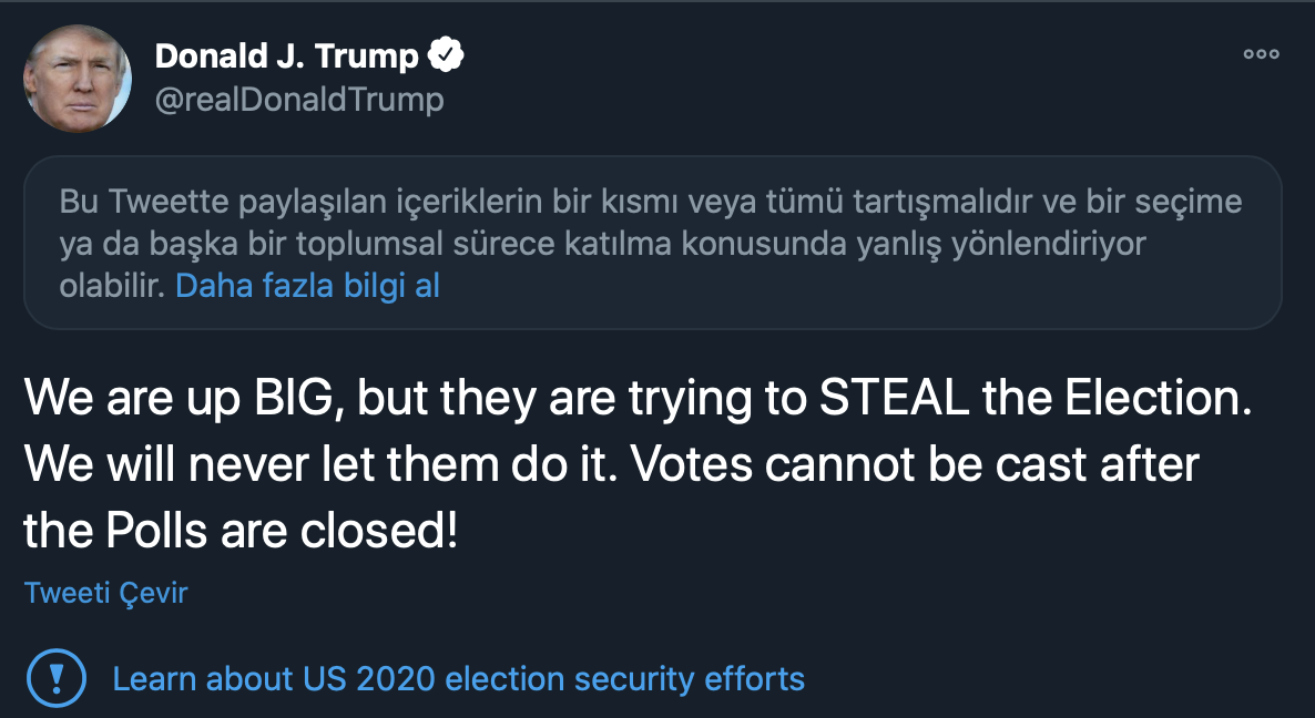 09.00 - Trump'ın "Açık ara öndeyiz ama oylarımızı çalmaya çalışıyorlar" tweetini Twitter engelledi.