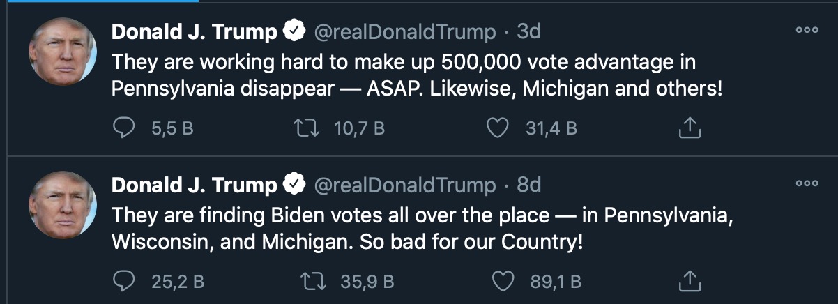 20.12 - Donald Trump oylarının hileye kurban gittiğini iddia etmeye devam ediyor. Trump Twitter'dan şu paylaşımlarda bulundu:
