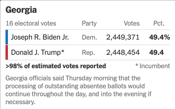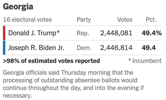 6 Kasım 12:45 - NYT'nin haberine göre, Biden Georgia'da 917 oy farkla öne geçti.