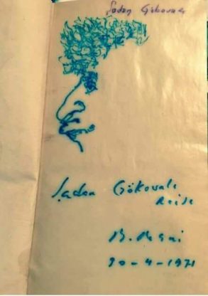 (Üstad kitabı 30 Nisan 1971'de bir akşam üzeri Kordon'da Erol'un Yeri'nde, kendi resmini çizerek imzalar "Ege Profesörü"