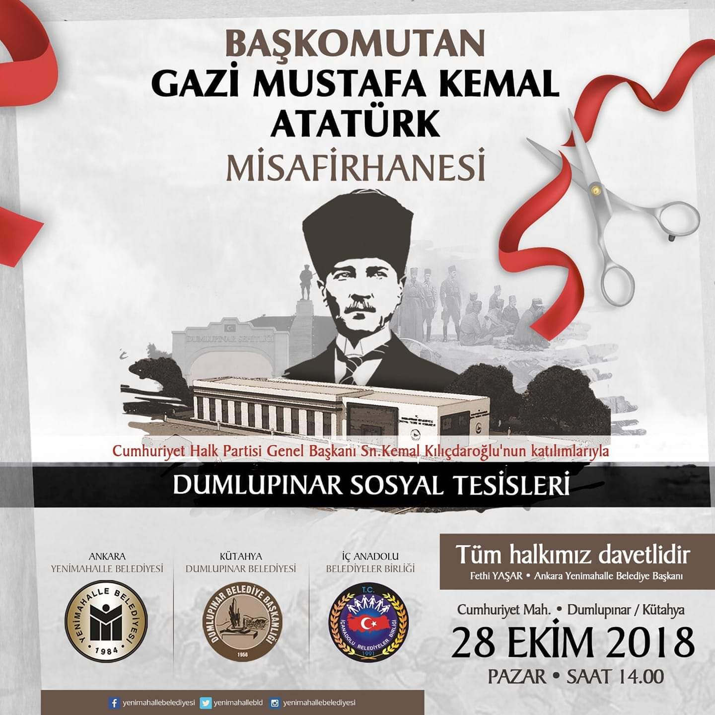 CHP Genel Başkanı Kemal Kılıçdaroğlu, Yenimahalle Belediye Başkanı Fethi Yaşar ve Dumlupınar'ın MHP'li Belediye Başkanı Niyazi Tezcan'la birlikte "Başkomutan Gazi Mustafa Kemâl Atatürk Sosyal Tesisleri''nin açılışını yapacak.