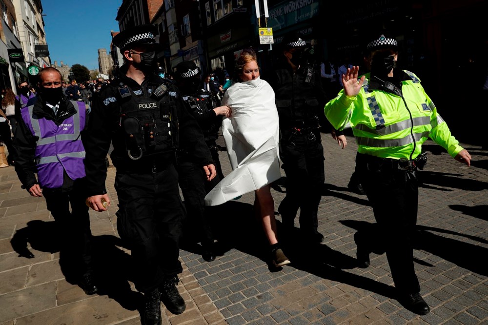 Eylemci kadına çok geçmeden müdahale eden polis ekipleri kadının üzerini örttü. Ardından tam olarak kontrol altına alınan kadın, gözaltına alındı. Törene sadece 30 kişinin katılmasına izin verilirken, halk, Windsor Kalesi dışında, töreni uzaktan seyretti.