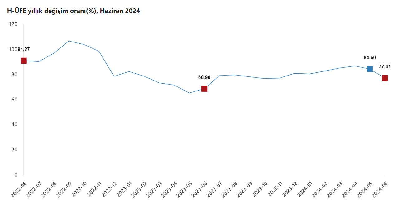 Haziran 2024'te Hizmet Üretici Fiyat Endeksi (H-ÜFE) verileri, bir önceki aya göre %5,30, bir önceki yılın Aralık ayına göre %37,96, bir önceki yılın aynı ayına göre %77,41 ve on iki aylık ortalamalara göre %81,16 artış gösterdi.