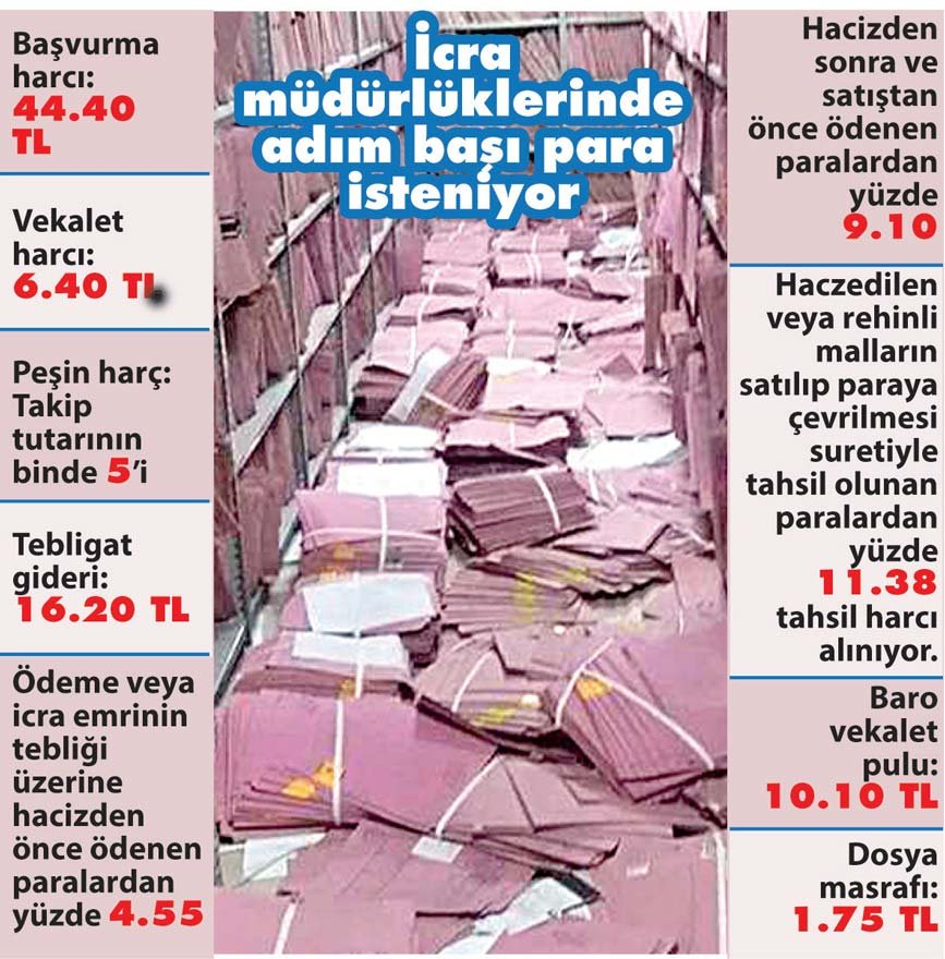 Sözcü'den Mehtap Özcan Ertürk'ün haberine göre, 100 bin TL tutarında bir icra takip dosyasında ilk başta alacaklının cebinden harç, pul, masraf adı altında 562.10 TL çıkıyor.