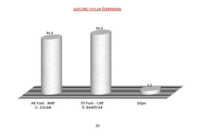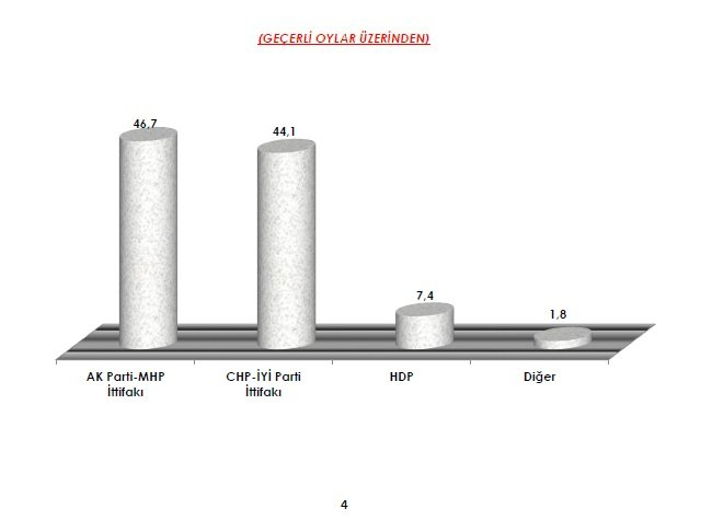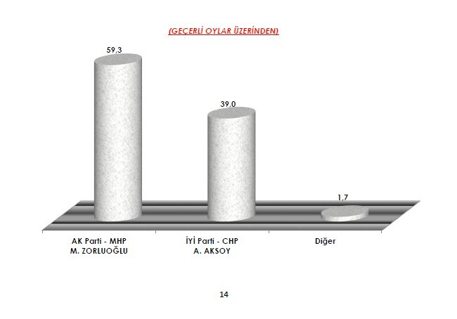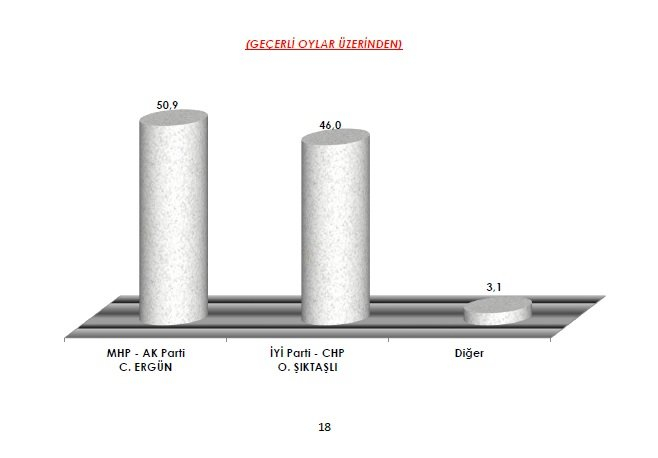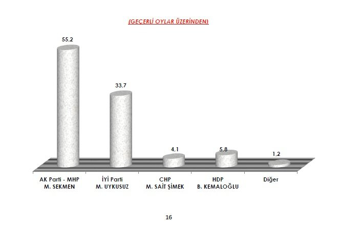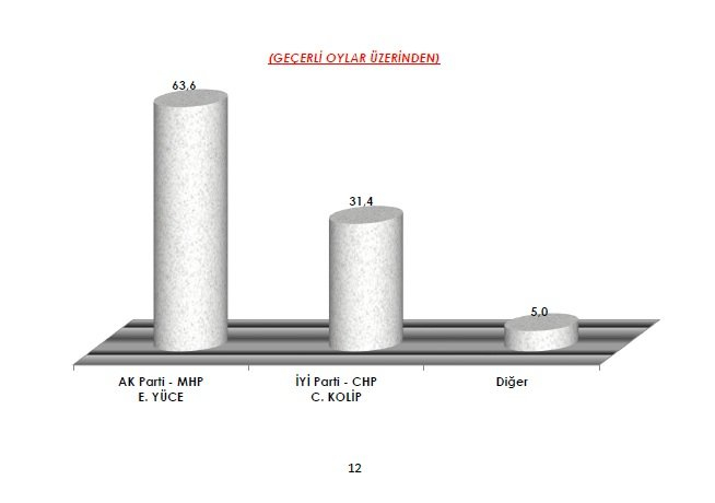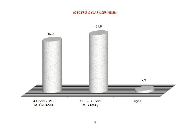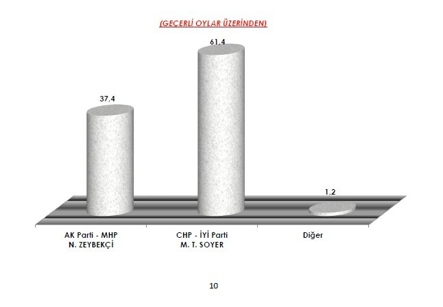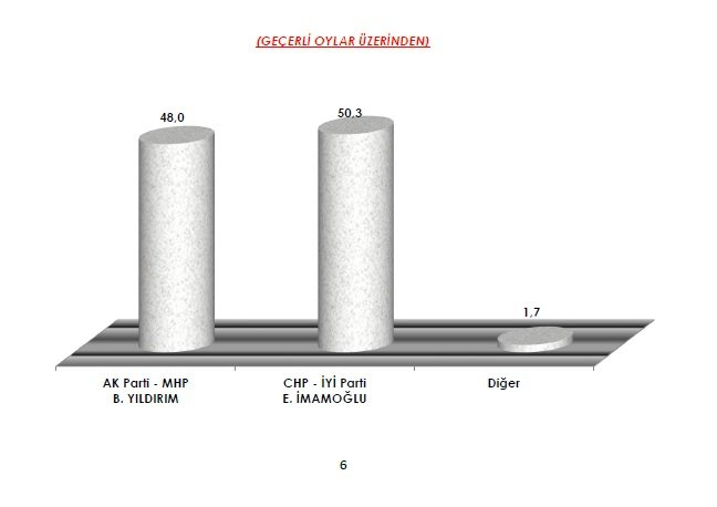 Geçerli oylar üzerinden yapılan ankete göre, CHP ve İYİ Parti’nin işbirliği İstanbul Büyükşehir Belediye Başkan adayı Ekrem İmamoğlu yüzde 50,3 görünürken Cumhur İttifakı’nın AKP’li İstanbul Büyükşehir Belediyesi Başkan adayı Binali Yıldırım yüzde 48,0 görünüyor.