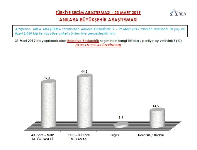 AREA Araştırma Şirketinin yaptığı son ankette Ankara’da Mansur Yavaş yüzde 44,3 oy alırken, Mehmet Özhaseki ise yüzde 39,3 görünüyor. İstanbul Büyükşehir Belediyesi için de Ekrem İmamoğlu yüzde 44 oy alırken, Binali Yıldırım yüzde 42,0 görünüyor.