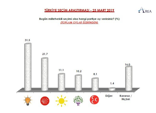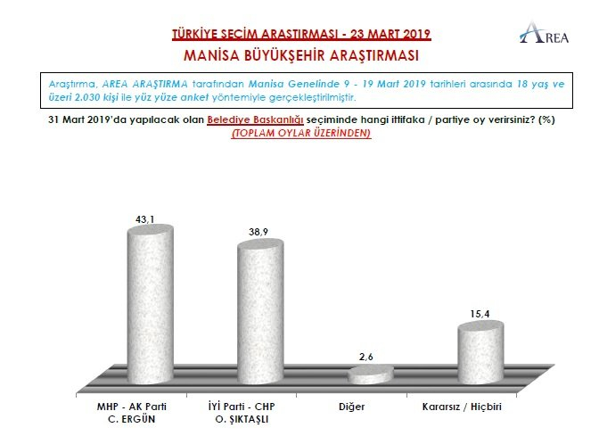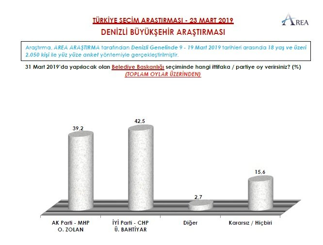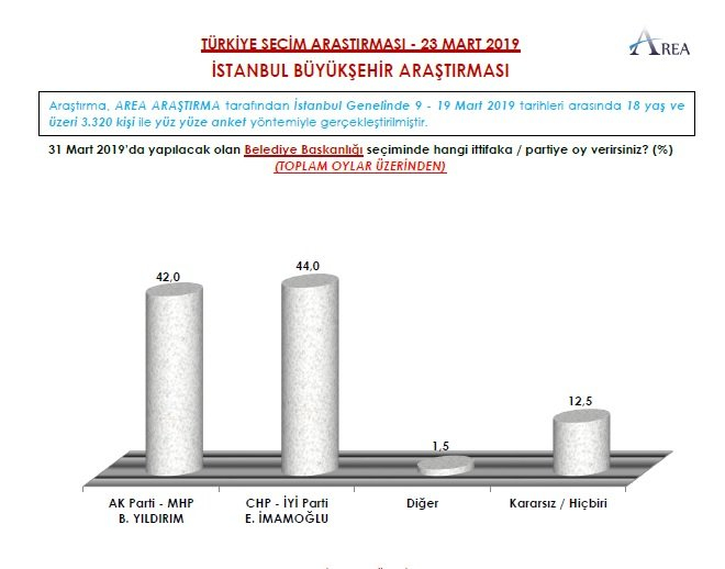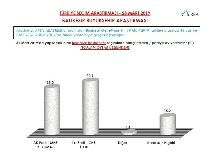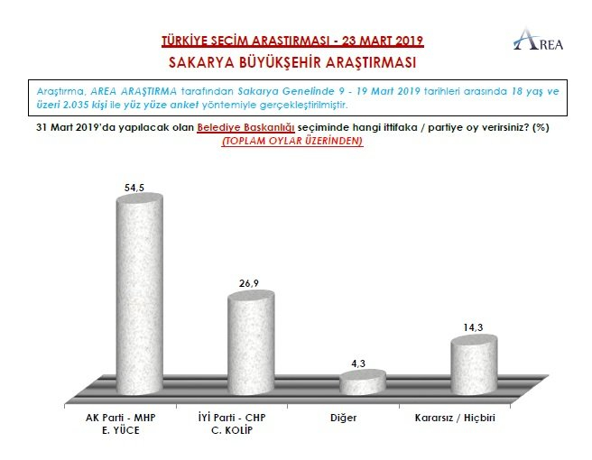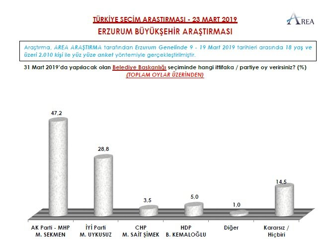 Yerel seçimler sayılı günler kala anket firmalarının açıkladıkları yerel seçim anketleri gündemde sıcaklığını korumaya devam ediyor. AREA Araştırma Şirketi, 31 Mart yerel seçimleri öncesinde İstanbul, Ankara, İzmir, Sakarya, Trabzon, Erzurum, Manisa, Denizli ve Balıkesir'e ilişkin yerel seçim anketinin sonuçlarını açıkladı. Araştırma AREA tarafından Türkiye genelinde NUTS2 bölge düzeyi 26 ilde 9-19 Mart 2019 tarihleri arasında 18 yaş ve üzeri 5.150 ile yüz yüze anket yöntemiyle gerçekleşti.