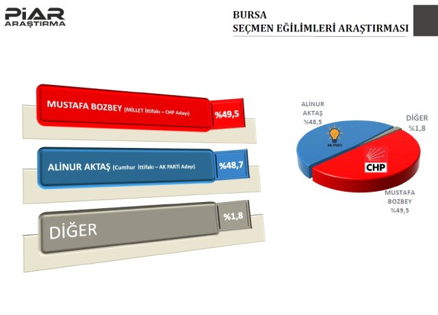 Yerel seçimlerin en tartışmalı illerinden birisi olan Bursa'da ise Millet İttifakı'nın CHP adayı Mustafa Bozbey, mevcut başkan Alinur Aktaş'ın yüzde 0,8 farkla önünde görülüyor.