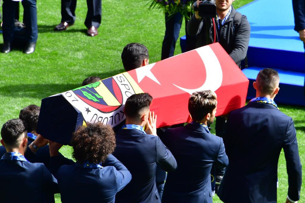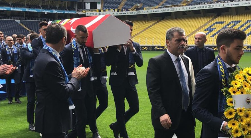 Can Bartu'nun eşi ve kızı ile Fenerbahçe Spor Kulübü yöneticileri, teknik heyeti ve profesyonel futbol takımının tüm futbolcuları saha ortasında, merhum Can Bartu'nun Türk bayrağına sarılı tabutunu karşıladı.