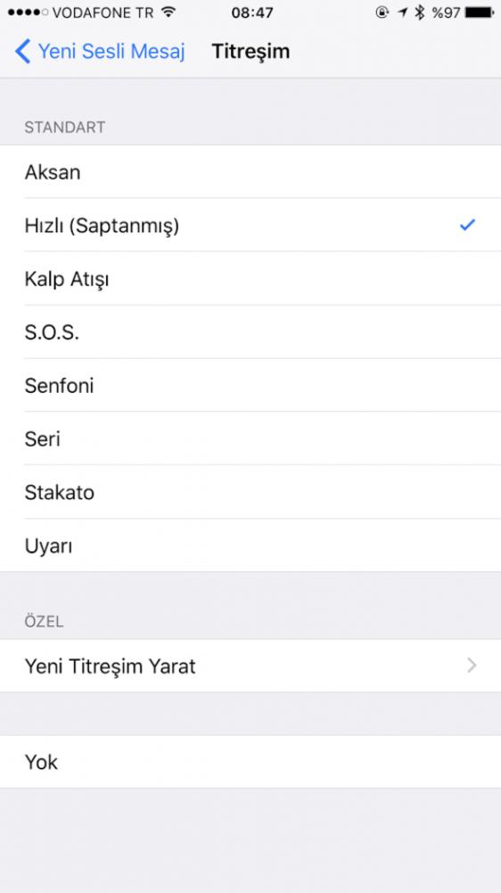 Titreşim seviyesini kendi istediğiniz şekilde değiştirebilirsiniz. Belli aralıklarla veya ritme titreşim almak için yapmanız gereken tek şey Ayarlar>Ses ve Dokunuş>Yeni Sesli Mesaj>Titreşim>Yeni Titreşim Yarat kısmına girmek.