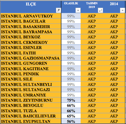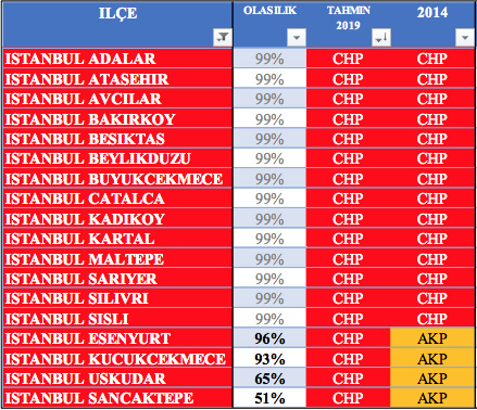 Çalışmaya göre, AKP’nin elinde bulundurduğu 4 ilçeKüçükçekmece, Sancaktepe, Üsküdar ve Esenyurt CHP’ye geçiyor. DSP’den Mustafa Sarıgül’ün yarıştığı Şişli’yi CHP alıyor. Adaları da CHP kazanıyor. Ankette HDP, MHP ve İyi Parti’nin de hiçbir ilçe kazanamayacağı tahmini yapıldı.