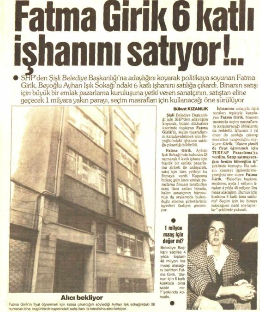 Şişli Belediye başkanlığına aday olduktan sonra tanıtım - propaganda masraflarını karşılamak için Beyoğlu'ndaki 6 katlı iş hanını 1 milyar liraya satılığa çıkardığı iddia edilmişti.