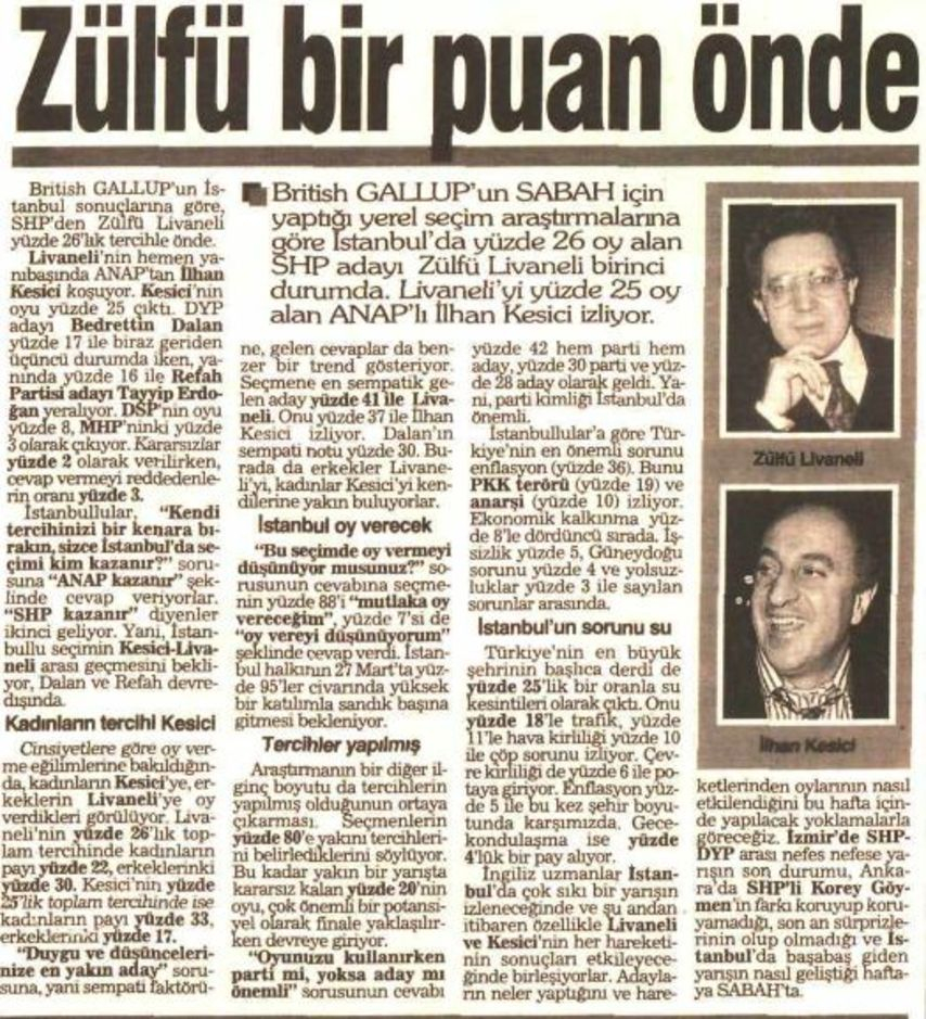 Dönemin bir araştırma şirketine göre 1994'teki seçimlerde İstanbul Büyükşehir Belediye Başkanlığı için yarış, Zülfü Livaneli ile ANAP adayı İlhan Kesici arasında geçecekti.