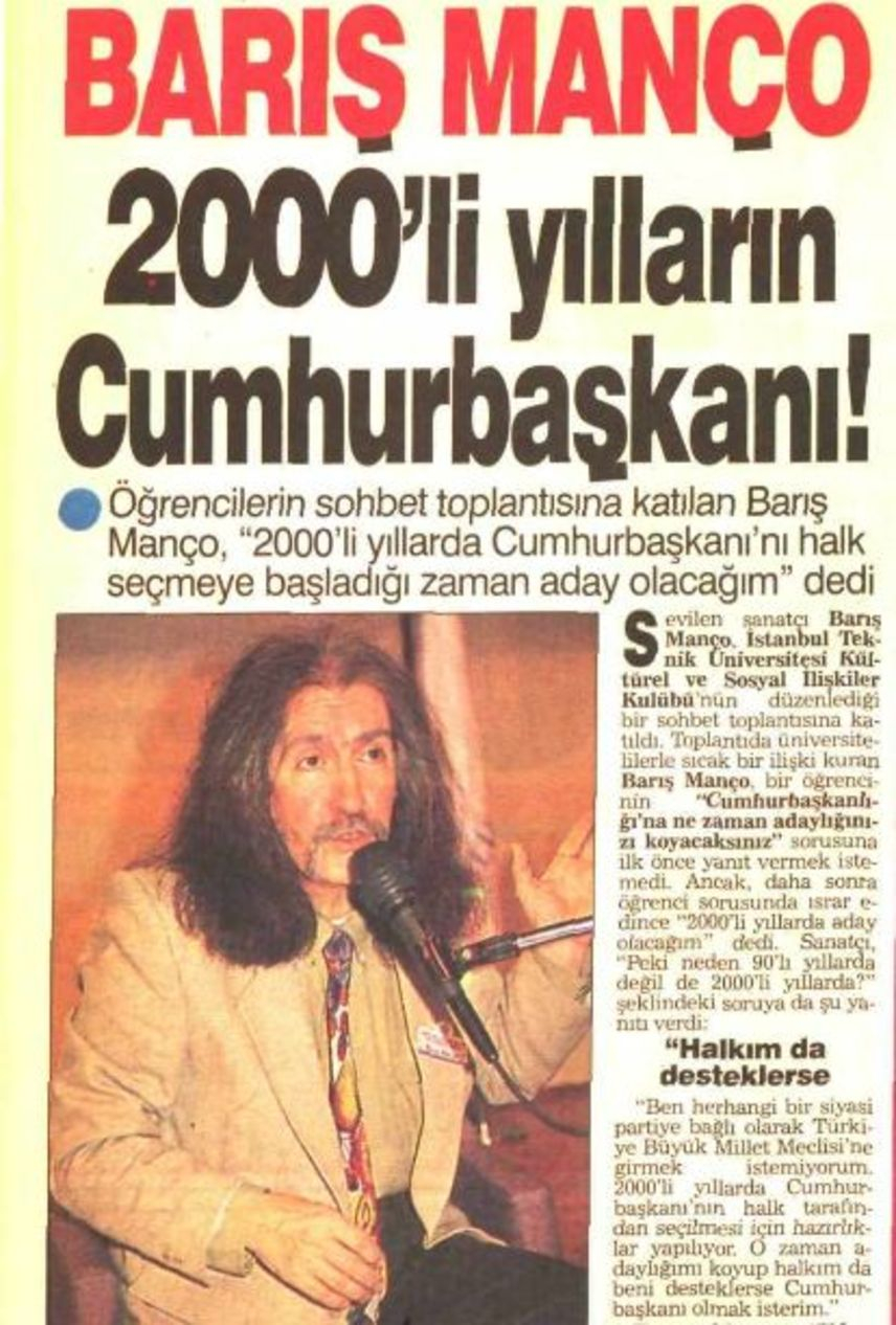 Barış Manço, Kadıköy Belediye başkanlığı için aday olmadan 2 yıl önce "2000'li yıllarda cumhurbaşkanını halk seçecek. Halkım desteklerse o zaman cumhurbaşkanı olmak isterim" demişti ama yerel seçimlerden sonra siyasetten uzaklaştı.