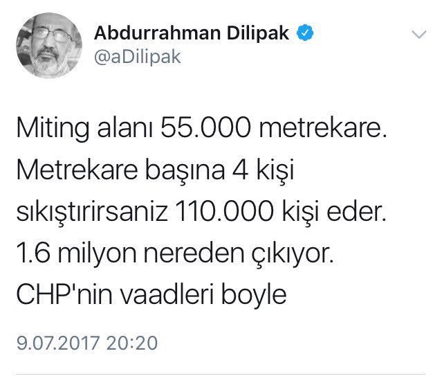 Dilipak, Twitter'daki sosyal medya hesabından, "Miting alanı 55.000 metrekare. Metrekare başına 4 kişi sıkıştırırsanız 110.000 kişi eder. 1.6 milyon nereden çıkıyor. CHP'nin vaadleri böyle" ifadelerini içeren tweet attı.