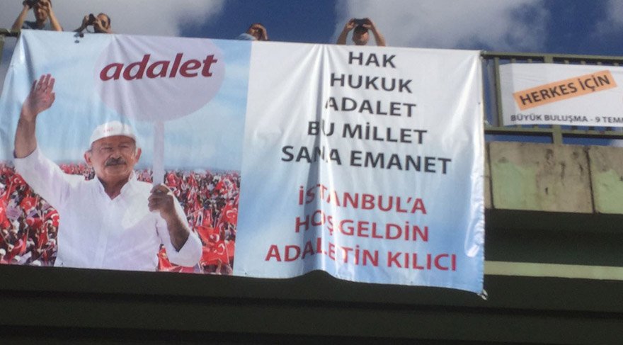 09:16 - Kılıçdaroğlu, "Hak, hukuk, adalet; bu millet sana emanet. İstanbul'a hoş geldin adaletin kılıcı" pankartıyla karşılandı.