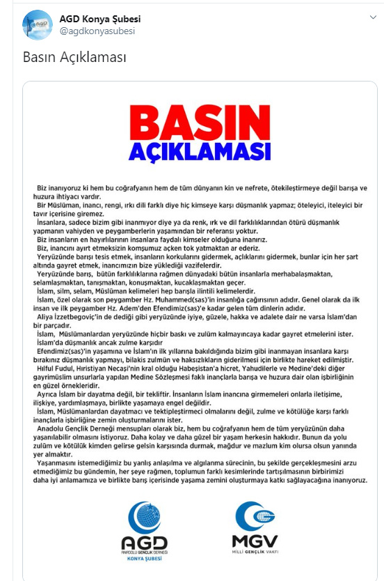 Konya’da belediyeye ait otobüs duraklarına asılan ve “Yahudileri ve Hristiyanları dost edinmeyin. Onlar birbirlerinin dostudurlar. Sizden kim onları dost edinirse, o da onlardandır. Allah zalimler topluluğunu doğru yola eriştirmez” ifadelerini içeren afişlerde imzası bulunan Anadolu Gençlik Derneği (AGD) Konya Şubesi ve Milli Gençlik Vakfı (MGV) afişlerin toplatılmasının ardından bir açıklama yaptı.
