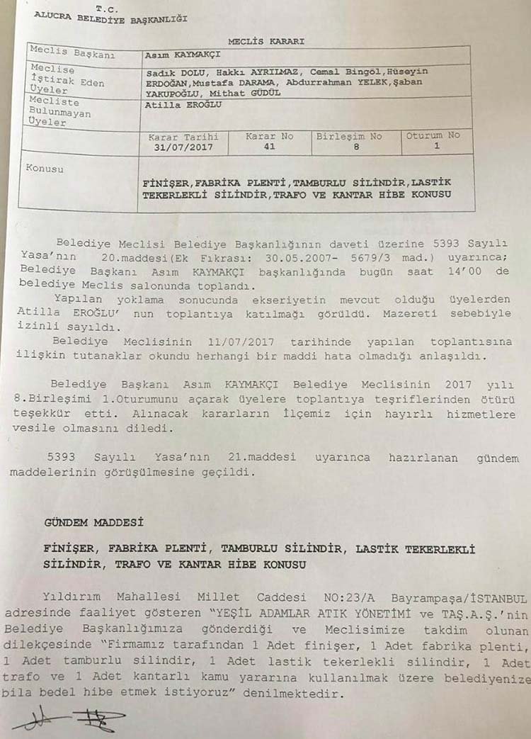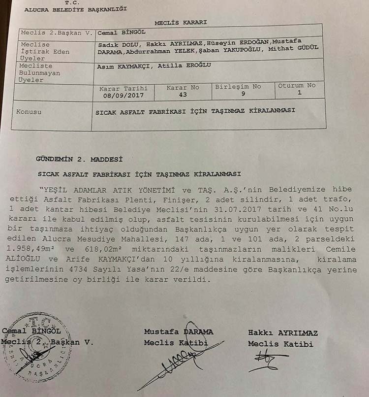 Sıcak asfalt tesisinin kurulması için 08.09.2017’de belediye meclisi toplandı. Belediye Başkanı AKP’li Asım Kaymakçı’nın katılmadığı oturumda, meclis uygun yer olarak belirlenen Mesudiye Mahallesinde bulunan ve Başkan Kaymakçı’nın akrabası olan Cemile Alioğlu ve Arife Kaymakçı’ya arsayı 15 bin TL aylık kirayla 10 yıllığına kiraladı. Arsaya kurulan tesis 2018 yılının başında hizmet vermeye başladı.