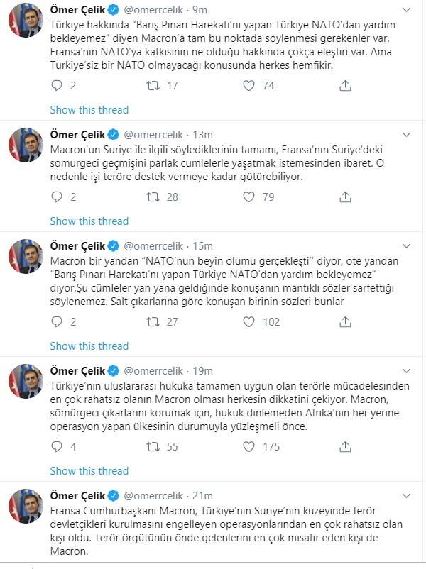 AKP Sözcüsü Ömer Çelik, "Türkiye'nin uluslararası hukuka tamamen uygun olan terörle mücadelesinden en çok rahatsız olanın Macron olması herkesin dikkatini çekiyor. Macron, sömürgeci çıkarlarını korumak için, hukuk dinlemeden Afrika'nın her yerine operasyon yapan ülkesinin durumuyla yüzleşmeli önce" dedi.