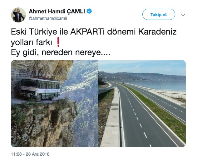 Çamlı, iki ayrı görseli kolajlayarak “Eski Türkiye ile AKPARTi dönemi Karadeniz yolları farkı! Ey gidi, nereden nereye....” diye yazdı.