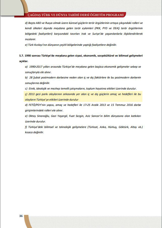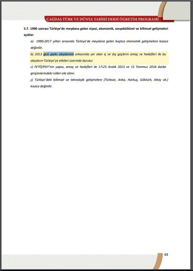 Milli Eğitim Bakanlığının (MEB) 2017 yılı eğitim-öğretim müfredatını açıklamasıyla ayrıntılarda belli olmaya başladı. 12. sınıfta verilecek "Çağdaş Türk ve Dünya Tarihi" dersi müfredatına düşman olarak Gezi Parkı Direnişi, 17-25 Aralık operasyonları ve 15 Temmuz darbe girişimi eklendi.