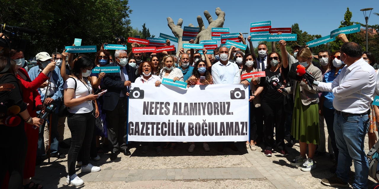 Grup, açıklamanın ardından, 'Özgür basın susturulamaz', 'Şiddete hayır' ve 'Nefes almak istiyoruz' sloganları attı, fotoğraf makineleri ile kameralarını yere koyarak tepkilerini gösterdi.