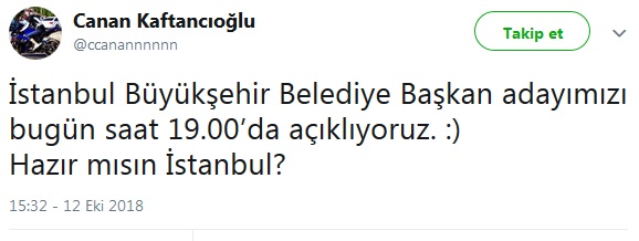 Canan Kaftancıoğlu, sosyal medya hesabı üzerinden yaptığı açıklamada, "İstanbul Büyükşehir Belediye Başkan adayımızı bugün saat 19.00’da açıklıyoruz." ifadelerini kullanırken "Hazır mısın İstanbul ?" sözlerini sarf etti.