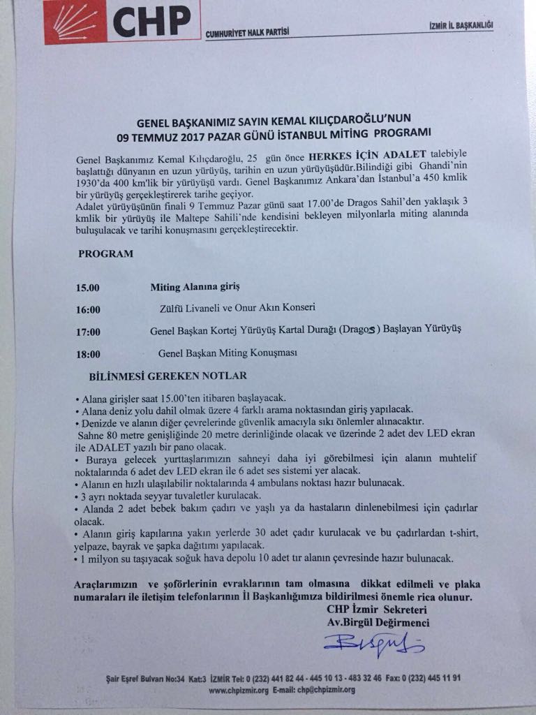 "Genel Başkanımız sayın Kemal Kılıçdaroğlu'nun 09 TEMMUZ 2017 PAZAR GÜNÜ İstanbul Miting Programı