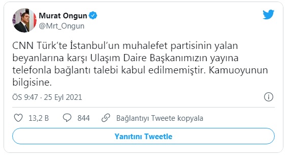 “CNN Türk’te İstanbul’un muhalefet partisinin yalan beyanlarına karşı Ulaşım Daire Başkanımızın yayına telefonla bağlantı talebi kabul edilmemiştir. Kamuoyunun bilgisine”