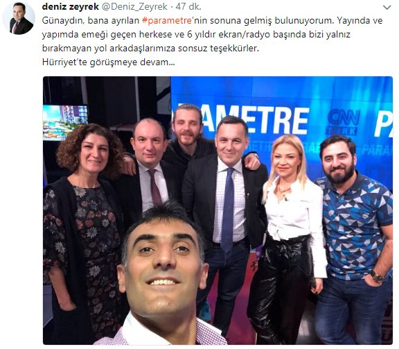 Hürriyet yazarı Deniz Zeyrek, CNN Türk'te yayınlanan Parametre programındaki görevine son verildiğini duyurdu.