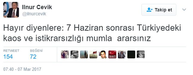 Cumhurbaşkanı Başdanışmanı İlnur Çevik, 16 Nisan’da yapılacak anayasa değişikliği referandumuna ilişkin “Hayır” kampanyası yürütenlere yönelik olarak “7 Haziran sonrası Türkiye’deki kaos ve istikrarsızlığı mumla ararsınız” dedi.