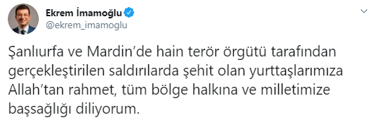 "Şanlıurfa ve Mardin’de hain terör örgütü tarafından gerçekleştirilen saldırılarda şehit olan yurttaşlarımıza Allah’tan rahmet, tüm bölge halkına ve milletimize başsağlığı diliyorum."
