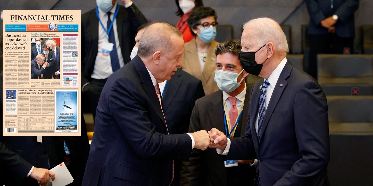 Erdoğan, ABD Başkanı Joe Biden ile göreve gelmesinin ardından ilk yüz yüze görüşmesini dün Brüksel'deki NATO zirvesi kapsamında gerçekleştirdi. Zirvenin ardından Birleşik Krallık merkezli Financial Times, Erdoğan ve Biden’ın bir fotoğrafını manşetinde kullandı.
