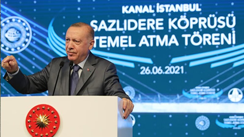Kanal İstanbul'un temel atma töreninde kürsüye gelen Erdoğan burada bir konuşma gerçekleştirdi.