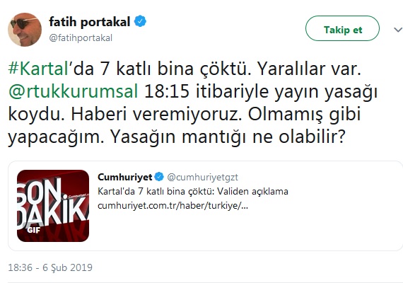 Sosyal medya hesabından açıklama yapan Fatih Portakal, "#Kartal’da 7 katlı bina çöktü. Yaralılar var. @rtukkurumsal 18:15 itibariyle yayın yasağı koydu. Haberi veremiyoruz. Olmamış gibi yapacağım. Yasağın mantığı ne olabilir?"