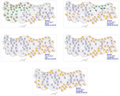 Meteoroloji tarafından yapılan son tahminlere göre ülkemizin kuzey, iç ve batı kesimlerinin parçalı yer yer çok bulutlu; Marmara, Ege, Batı Akdeniz, İç Anadolu’nun kuzeyi, Batı Karadeniz, Orta Karadeniz, Doğu Karadeniz kıyıları ve Gümüşhane çevrelerinin yağışlı, diğer yerlerin parçalı ve az bulutlu geçeceği tahmin ediliyor. Genellikle yağmur ve sağanak, Batı Karadeniz'in iç kesimlerinin yüksekleri ile Sivas, Yozgat ve Gümüşhane çevrelerinde karla karışık yağmur ve kar şeklinde olması beklenen yağışların Kıyı Ege ve Çanakkale çevreleri ile Balıkesir’in batı kesimlerinde yer yer kuvvetli (21-50 Kg/m2) olması bekleniyor. Sabah ve gece saatlerinde İç Anadolu’nun güneyi ve doğusu ile doğu kesimlerde yer yer sis ve pus olayı meydana geleceği tahmin ediliyor.