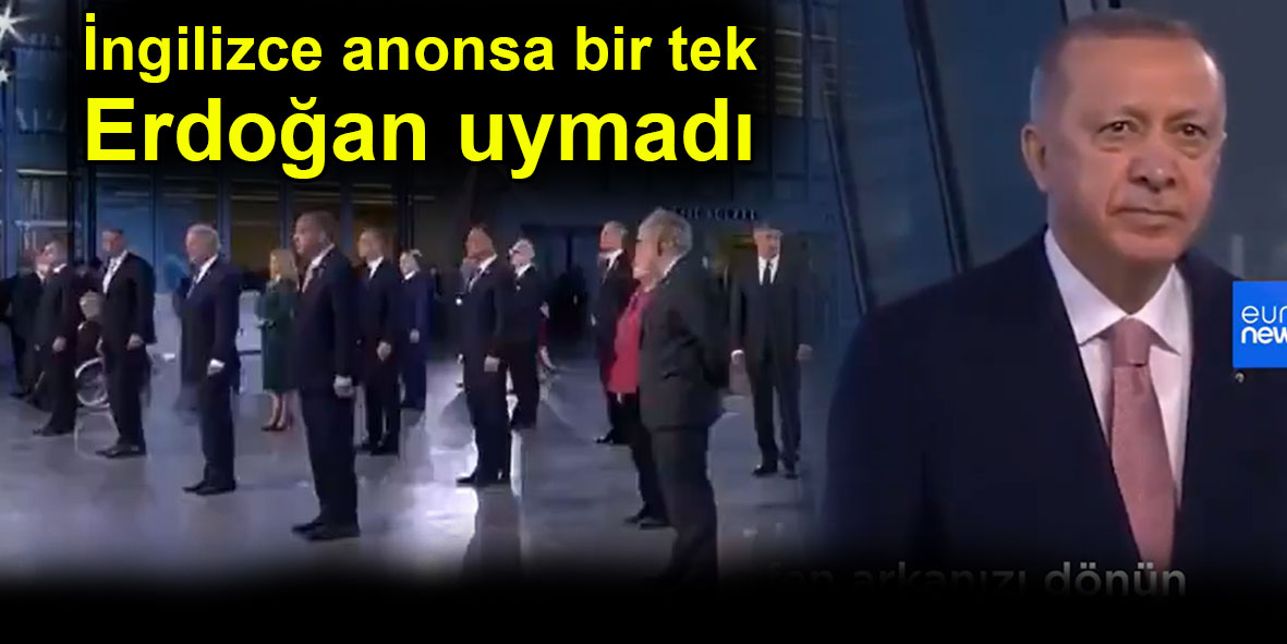 NATO üyesi 30 ülkenin liderleri Brüksel'deki zirve için bir araya geldi, aile fotoğrafı için poz verdi. Fotoğraf çekiminin ardından İngilizce yapılan 'lütfen dönün' anonsuna diğer liderler uyarken bir tek Erdoğan dönmedi. Erdoğan'ın herkesin dönmesinin ardından anonsa uyduğu görüldü.