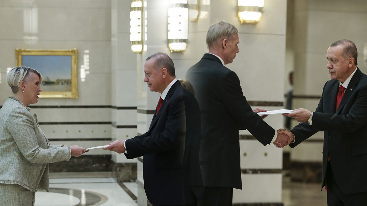 Saraydaki kabulde Büyükelçi Mcguiness ve Skjonsberg, Erdoğan'a güven mektubu sundu.