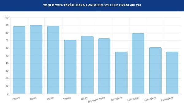 En düşük su seviyesine sahip Sazlıdere Barajı’nda su miktarı yüzde 54,99 olarak ölçülürken en yüksek su miktarı ise yüzde 90,07 ile Darlık Barajı’nda ölçüldü. Megakentte barajlardaki toplam doluluk oranı ise 20 Şubat 2024 Salı günü itibarıyla yüzde 76,16 olarak ölçüldü.