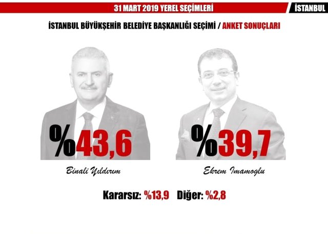 Araştırmaya katılanların yüzde 43,6'sı 31 Mart'ta tercihini Binali Yıldırım'dan yana kullanacağını belirtirken, yüzde 39,7'lik kesim Ekrem İmamoğlu'na oy vereceği yönünde görüş bildirdi.