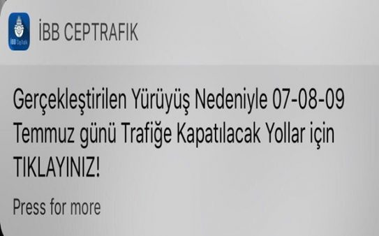 İstanbul Büyükşehir Belediyesi, İBB Cep Trafik aplikasyonu kullanıcılarına gönderdiği trafiğe kapalı yollar uyarısını içeren mesajında, Adalet Yürüyüşü’nü “gerçekleştirilen yürüyüş” nedeniyle diye tanımlayarak “Adalet” diyemedi.