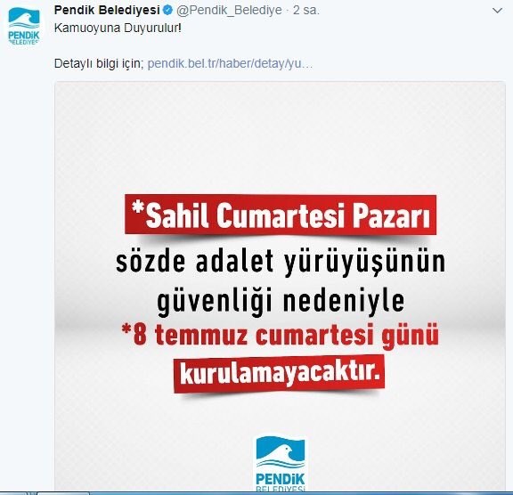 AKP’li Pendik Belediyesi de 9 Temmuz Pazar günü Maltepe Sahili’nde gerçekleştirilecek Adalet Mitingi için, yaptığı bir paylaşımda “sözde” Adalet Yürüyüşü tanımında bulunarak, Cumartesi günleri sahil yolunda kurulan pazarın iptal edilme gerekçesini de Adalet Yürüyüşü olarak göstermişti.