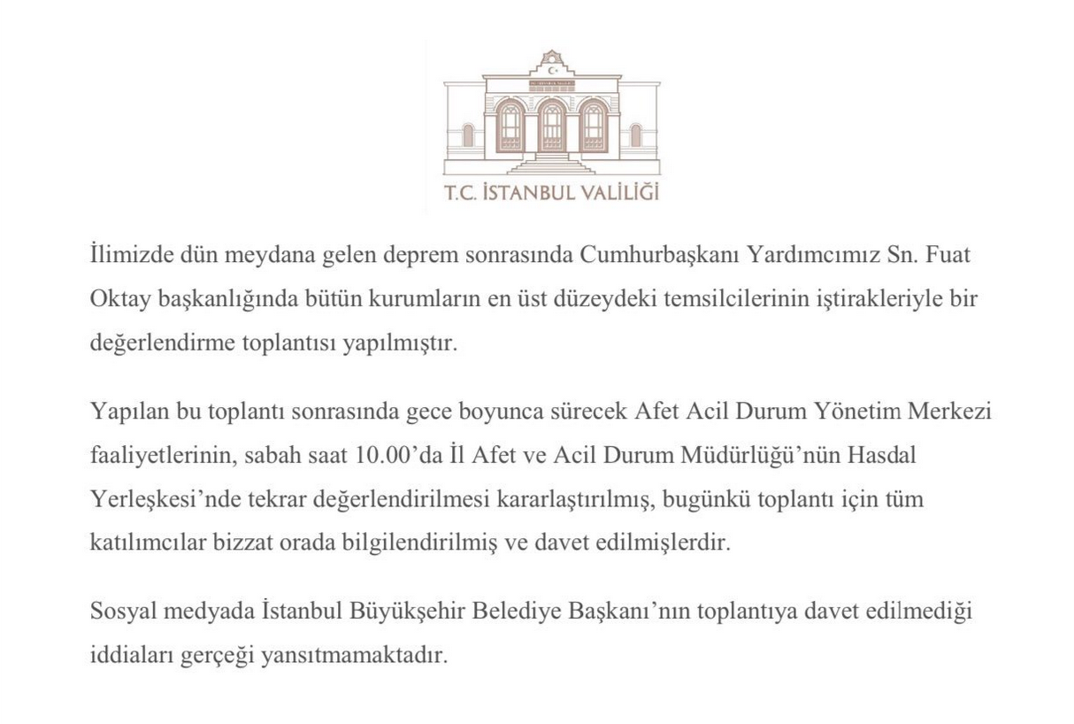 Söz konusu iddianın ardından İstanbul Valiliği sosyal medya hesabından, "Yapılan bu toplantı sonrasında gece boyunca sürecek Afet Acil Durum Yönetmelik Merkezi faaliyetlerinin sabah saat 10:00'da İl Afet ve Acil Durum Müdürlüğü'nün Hasdal Yerleşkesi'nde tekrar değerlendirilmesi kararlaştırılmış, bugünkü toplantı için katılımcılar bizzat orada bilgilendirilmiş ve davet edilmişlerdr. Sosyal medyada İstanbul Büyükşehir Belediye Başkanı'nın toplantıya davet edilmediği iddiaları gerçeği yansıtmamaktadır." açıklaması yapıldı.