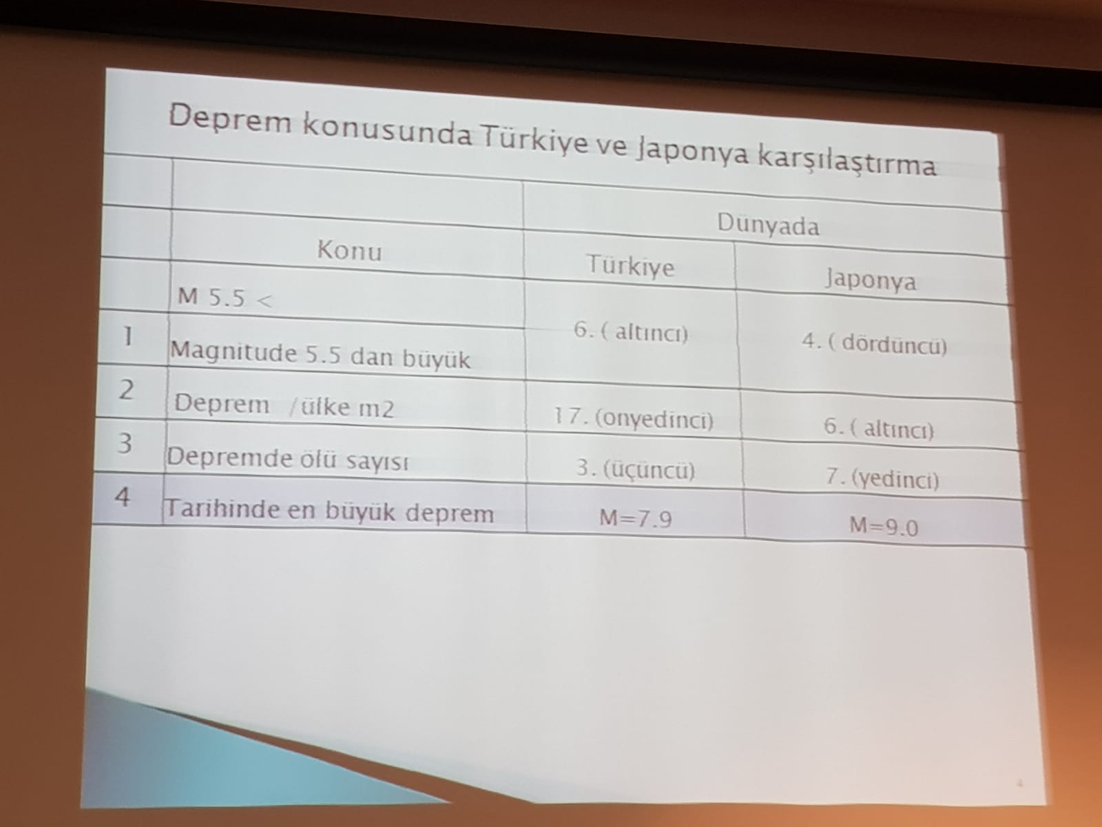 Deprem Uzmanı Moriwaki, Türkiye topraklarının yüzde 97’sinin deprem riski taşıdığını söyledi. Deprem konusunda Türkiye ve Japonya’ya ilişkin kıyaslamalar yapan Moriwaki, yüzölçümü bakımından Türkiye’nin yarısı kadar alana sahip Japonya’nın Türkiye’nin 2 katı nüfusa sahip olduğunu kaydetti. Bu nedenle Japonya’da gökdelen yapmanın zorunluluğuna dikkati çeken Moriwaki, Türkiye’de son yıllarda sayısı hızla artan gökdelenlere ise bir anlam veremediğini söyledi. Moriwaki, dünyada deprem sayısı sıralamasında Japonya’nın 4’üncü, Türkiye’nin ise 6’ncı sırada yer aldığına dikkati çekti. Depremlerdeki ölü sayısı bakımından ise Japonya’nın 7’nci sırada, Türkiye’nin 3’üncü sırada olduğunu vurgulayan Moriwaki, Türkiye açısından son derece olumsuz bu tablonun inşa edilen yapıların yetersizliğinden kaynakladığını kaydetti.