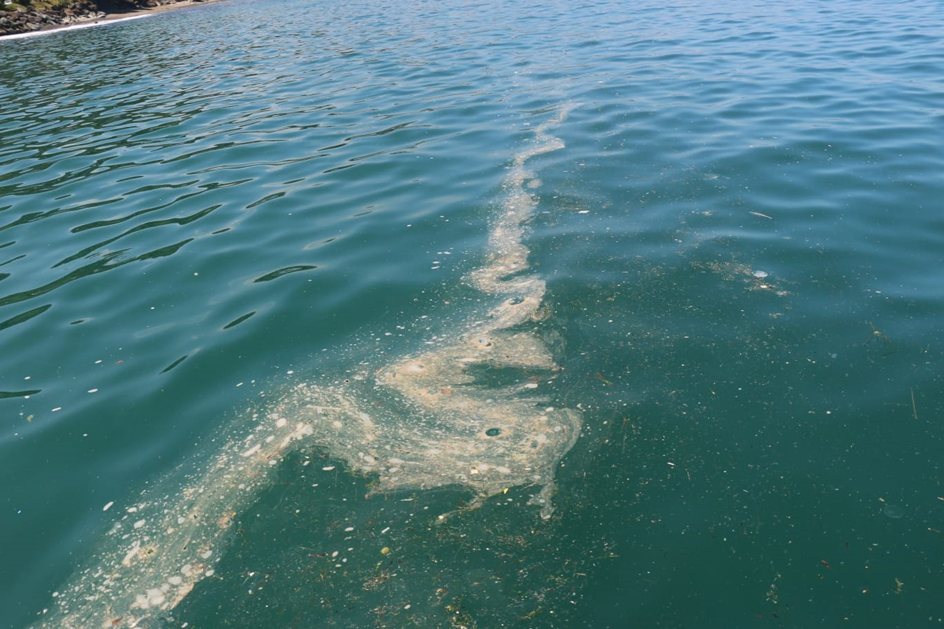 Müsilaj şüphesi oluşturan ve kıyı boyunca şerit şeklinde uzanan kirliliği açıklayan Prof. Dr. Feyzioğlu, “Görmüş olduğumuz diğer yapıysa muhtemelen denizdeki 1-2 gün öncesindeki dalgalı ve havadan kaynaklanan bir akümülasyondan kaynaklanıyor çünkü bir hat üzerinde dalgayla beraber kıyıya yaklaşan bir yapı. Uzaktan böyle müsilajmış gibi görünüyor ama yanına gidilip bakıldığında naylon, plastik gibi yapılardan oluşan ince 1 metre civarında kalınlığı olan ince uzun şerit halinde bir bütün kıyıyı kaplamış vaziyette gözledik. Onun dışında pek buna benzer bir yapı gözlenmedi” dedi.