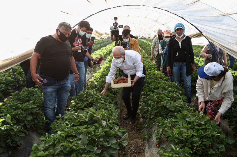 Aydın’a bir dizi ziyaret için gelen CHP Genel Başkanı Kemal Kılıçdaroğlu'nun ilk durağı, İncirliova ilçesi Karabağ Mahallesi'ndeki çilek tarlası oldu.
