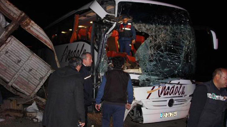 Kaza, bugün saat 06.00 sıralarında, İzmir- Ankara D-300 karayolu üzerinde, Esenyazı- Gökçeören Kavşağı arasındaki yolda meydana geldi. Ankara'dan İzmir'e giden, Barış Doğrusöz yönetimindeki 50 DK 264 plakalı, Anadolu Turizm'e ait şehirlerarası yolcu otobüsü, önünde giden Halil Zeybek yönetimindeki 45 N 9998 plakalı TIR'a arkadan çarptı. Çarpmanın etkisiyle TIR'da yüklü pancar küspeleri yola döküldü. Kazada, 27 yolcunun bulunduğu otobüsteki 20 kişi yaralandı. İhbar üzerine olay yerine sağlık, itfaiye ve jandarma ekipleri geldi. İtfaiye ekipleri araçta sıkışan 2 yolcuyu kurtardı. Yaralı 20 yolcu ambulanslarla çevre hastanelere kaldırıldı. Yaralılardan 2'sinin hayati tehlikesinin bulunduğu belirtildi. İzmir yönüne yaklaşık 1,5 saat kapalı kalan yol, araçların çekilmesiyle normal seyrine döndü. Jandarma, kazayla ilgili soruşturma başlattı.