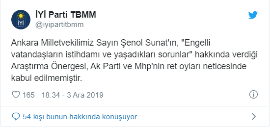 İYİ Parti Toplumsal Politikalar Başkanı ve Ankara Milletvekili Şenol Sunat’ın "Engelli vatandaşların istihdamı ve yaşadıkları sorunlar" hakkında verdiği Araştırma Önergesi, AKP ve MHP’li vekillerin ‘ret’ oyu ile Meclis’te kabul edilmedi.