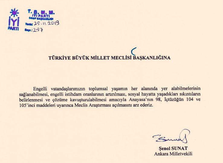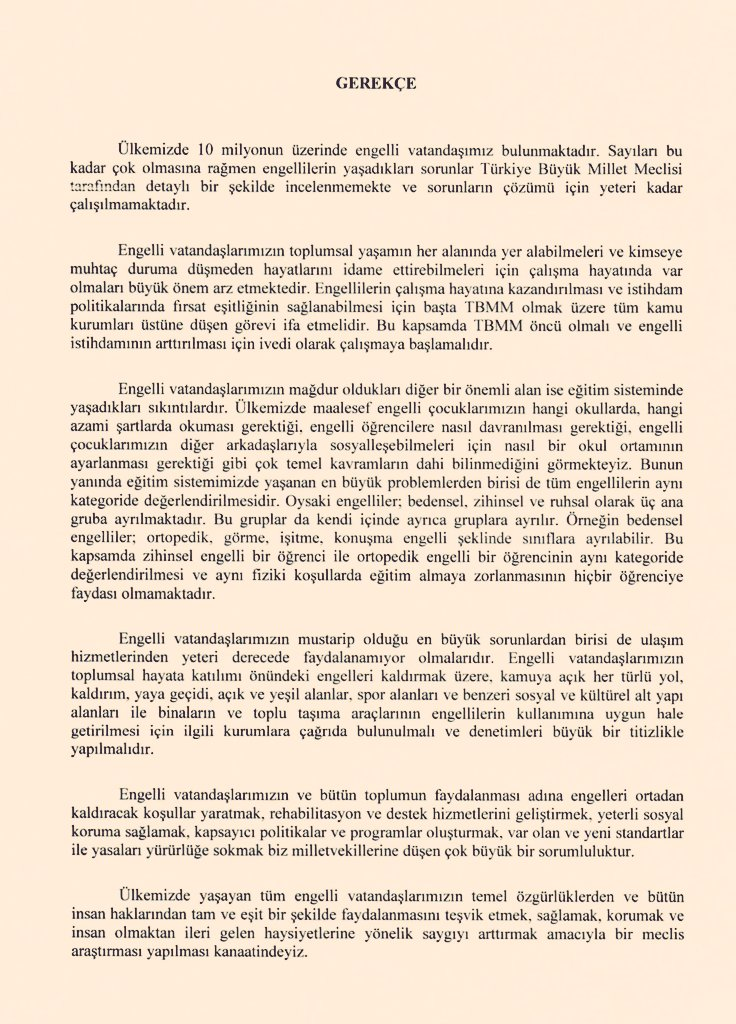 Yeniçağ'ın aktardığına göre; engelli vatandaşlarımızın sorunlarına dikkat çekilen araştırma önergesinde, yeterli istihdamın sağlamadığı belirtilirken, “Ülkemizde yaşayan tüm engelli vatandaşlarımızın temel özgürlüklerden ve bütün insan haklarından tam ve eşit bir şekilde faydalanmasını teşvik etmek, sağlamak, korumak ve insan olmaktan iler gelen haysiyetlerine yönelik saygıyı artırmak amacıyla bir Meclis araştırması yapılması kanaatindeyiz” ifadelerine yer verildi.