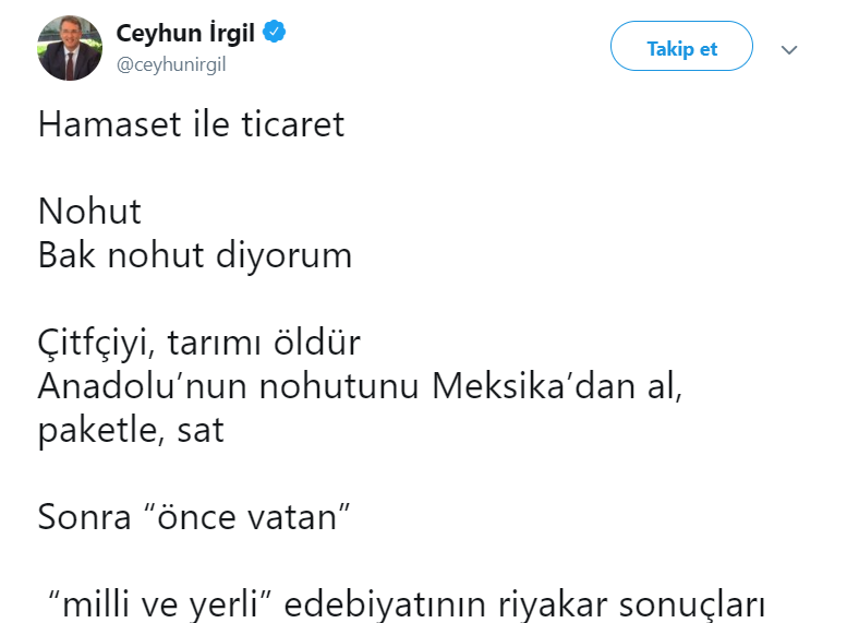 CHP 26'ıncı dönem Bursa Milletvekili Ceyhun İrgil sosyal medya hesabından yaptığı açıklamada, ''Çiftçiyi, tarımı öldür. Anadolu’nun nohutunu Meksika’dan al. Paketle sat. Sonra 'önce vatan'. 'Milli ve yerli' edebiyatının riyakar sonuçları'' ifadelerini kullandı.